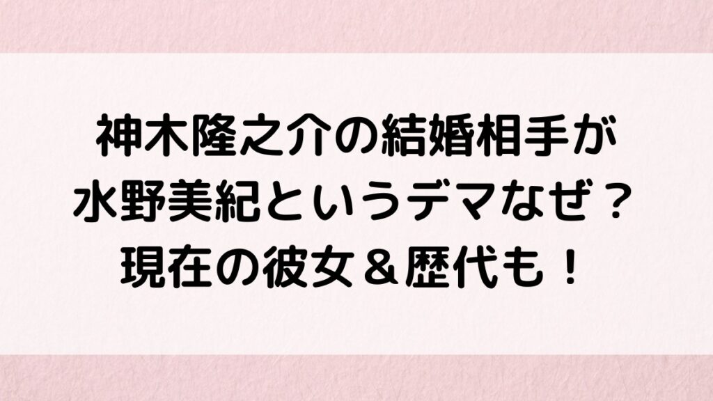 子役時代から活躍する俳優の神木隆之介(かみきりゅうのすけ)さんが結婚して、結婚相手が水野美紀さんだとSNSでも大変噂になっていました。 事実であれば俳優同士の結婚となり、神木隆之介さんと水野美紀さんは年の差カップルとしても大スクープですが、... -